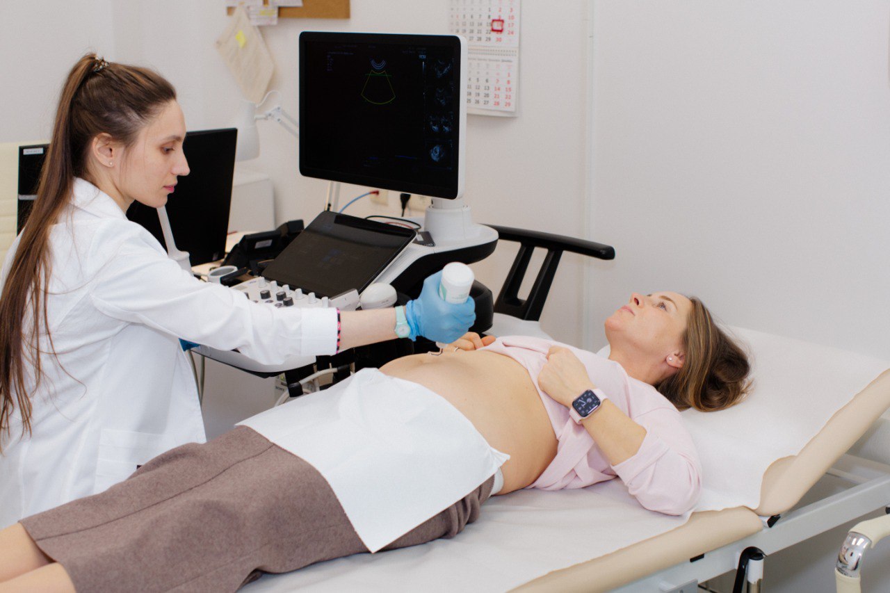 • Пациентка располагается на кушетке, врач наносит гель на область живота: он нужен для лучшего контакта датчика с кожей.